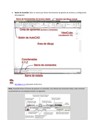 Este documento presenta una introducción a AutoCAD 2D. Explica los componentes básicos de la interfaz como el área de dibujo, la barra de texto y la cinta de opciones. Describe cómo comunicarse con AutoCAD usando comandos y cómo usar herramientas como zoom y pan. También cubre la creación y personalización de plantillas, y presenta una práctica para dibujar una fachada usando comandos como desfase, matriz y simetría.