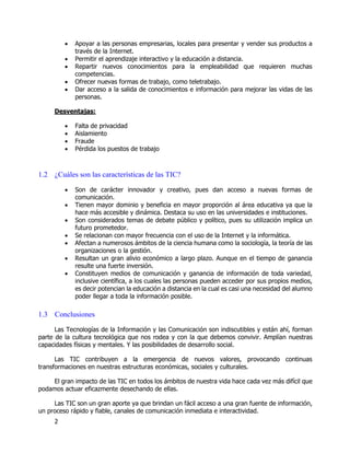 El documento describe la historia y el desarrollo de las tecnologías de la información y la comunicación (TIC) y los ordenadores. Explica que las TIC son un conjunto de herramientas que procesan y almacenan información para mejorar la calidad de vida. Luego detalla los orígenes y avances clave en el desarrollo de los ordenadores, incluyendo la creación de las primeras máquinas programables en la década de 1930, el desarrollo del transistor y el circuito integrado en los años 1950 y el surgimiento de los ordenadores