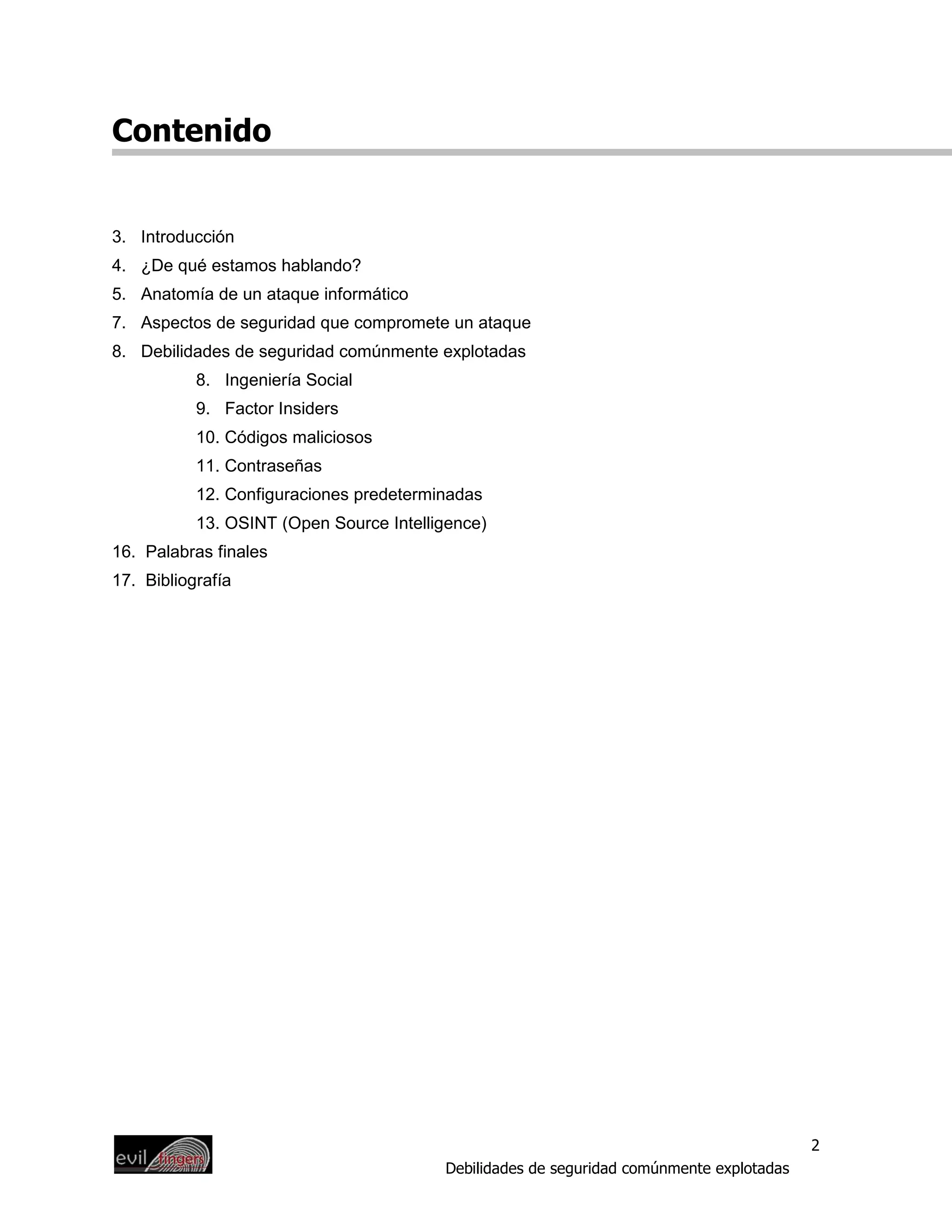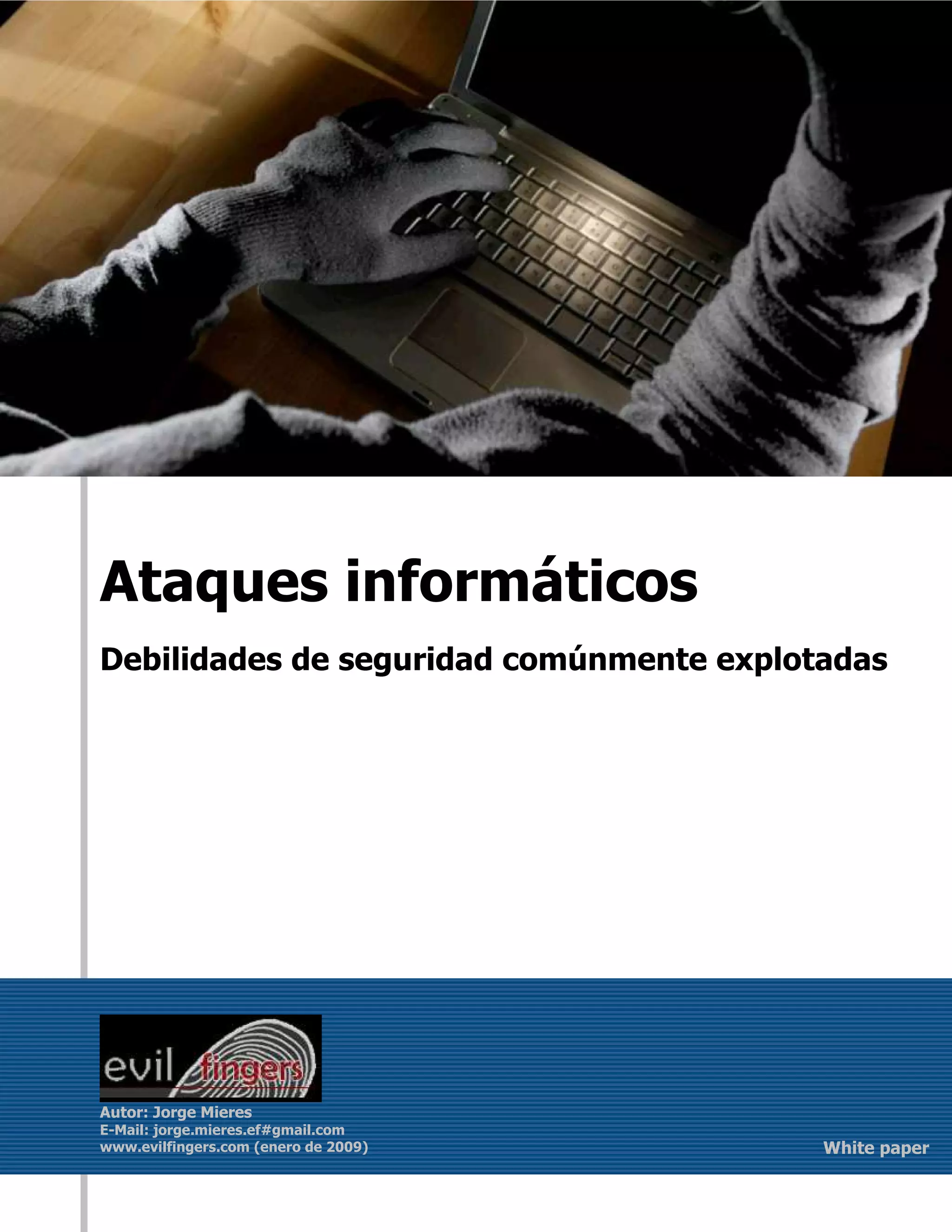Este documento describe las debilidades de seguridad más comúnmente explotadas en los ataques informáticos, incluyendo la ingeniería social, factores internos, códigos maliciosos, contraseñas débiles y configuraciones predeterminadas. Explica que la ingeniería social que explota las debilidades humanas es una de las estrategias más efectivas. También señala que los empleados insatisfechos internos representan una gran amenaza y que los códigos maliciosos como malware son una amenaza frecuente.