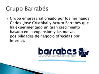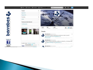 Este documento describe la estrategia de marketing en redes sociales del grupo empresarial Barrabes. Barrabes comenzó como una tienda de equipos de montañismo en los años 90 y ha crecido significativamente gracias a Internet. Actualmente usa redes sociales como Facebook, Twitter y su propia red Barrabes&friends para interactuar con clientes, ofrecer contenido de valor y aumentar el tráfico a su sitio web. La estrategia se centra en publicar contenido relevante para los usuarios y medir el éxito de los clientes en redes sociales.