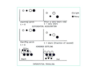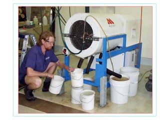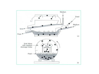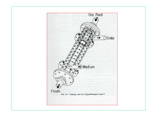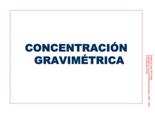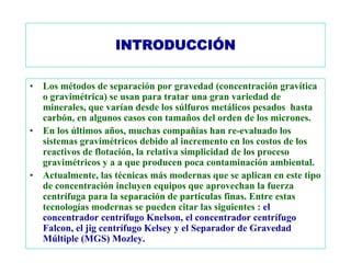 Este documento proporciona una introducción a los métodos de concentración gravimétrica. Explica los principios básicos de la separación por gravedad y densidad de partículas. Además, describe varios métodos específicos como la separación en medios densos, en corrientes verticales u horizontales, y el efecto del tamaño de partícula. Finalmente, analiza criterios de concentración y diferentes tipos de equipos utilizados comúnmente.