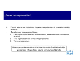 El documento presenta conceptos básicos sobre organizaciones, gestión, eficiencia, eficacia y las funciones de los gerentes. Explica que una organización tiene una finalidad, personas estructurada, y que la gestión consiste en coordinar actividades de manera eficiente y eficaz. Define eficiencia como obtener mayores resultados con menos recursos, y eficacia como lograr los objetivos. Finalmente, resume que los gerentes se encargan principalmente de la planeación, organización, dirección y control de una organización.