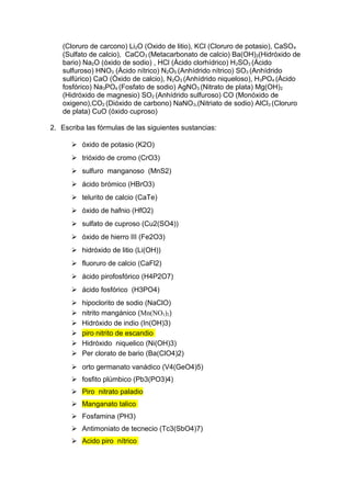 sulfúrico) CaO (Óxido de calcio), N2O3 (Anhídrido niqueloso), H3PO4 (Ácido