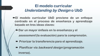 El modelo curricular Understanding by Design (UbD) se basa en tres ideas claves: 1) dar más énfasis a la enseñanza y evaluación para la comprensión de los estudiantes, 2) priorizar la transferencia del aprendizaje, y 3) planificar mediante un diseño inverso que comienza con los resultados deseados. El diseño inverso implica tres etapas: identificar los resultados de aprendizaje, definir las evidencias de evaluación, y diseñar las actividades de aprendizaje. El objetivo del modelo es mejorar el rendimiento estudiantil