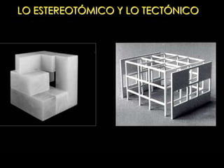 El documento analiza la diferencia entre lo estereotómico y lo tectónico en arquitectura. Lo estereotómico se refiere a la arquitectura masiva de piedra o ladrillo donde la gravedad se transmite de forma continua a través de la compresión. Lo tectónico se refiere a la arquitectura ligera que enfatiza la adición y el espacio vacío, donde la gravedad se transmite de forma discontinua a través de nudos y uniones. Mientras lo estereotómico conserva el muro só