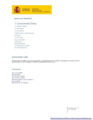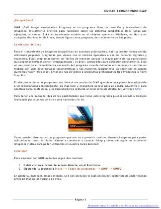 Este documento presenta una introducción al programa GIMP para edición y manipulación de imágenes. Explica las diferentes ventanas y herramientas del programa, así como cómo crear una nueva imagen, seleccionar herramientas y realizar ediciones básicas. El documento está dividido en 12 unidades que cubren temas como capas, texto, filtros, color y animación para enseñar las funcionalidades avanzadas de GIMP.