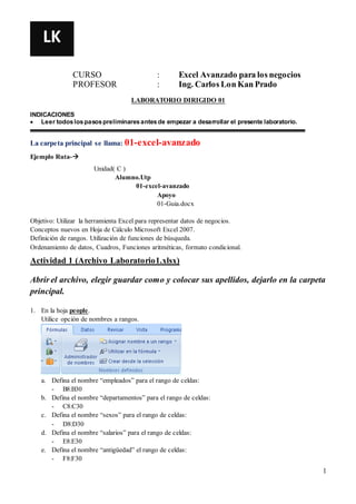 Este documento presenta 8 actividades para el curso de Excel Avanzado para los negocios. Las actividades cubren temas como el uso de funciones de búsqueda, ordenamiento de datos, cuadros, funciones aritméticas y formato condicional. También incluye ejercicios sobre validación de datos, cálculo de costos totales y la creación de consultas automáticas utilizando funciones de Excel.