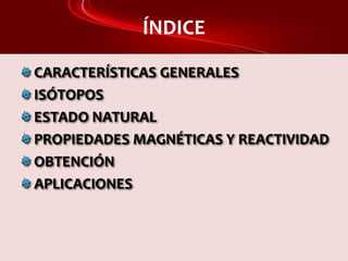 Este documento proporciona información sobre el hidrógeno, incluyendo sus características generales, isótopos, estado natural, propiedades magnéticas y reactividad, obtención y aplicaciones. El hidrógeno es el elemento más ligero, se obtiene principalmente a partir del metano y por electrólisis del agua, y se utiliza para producir amoníaco, metanol y en pilas de combustible como una alternativa a los combustibles fósiles.