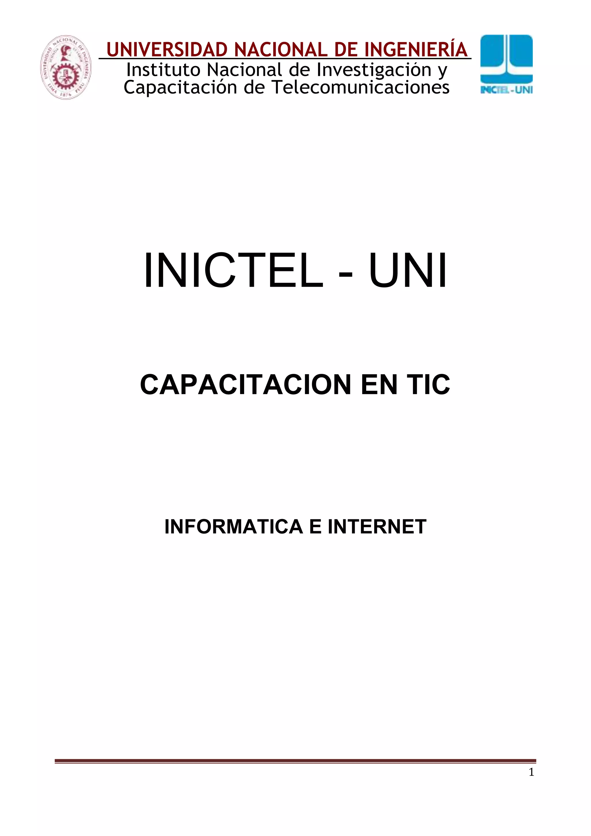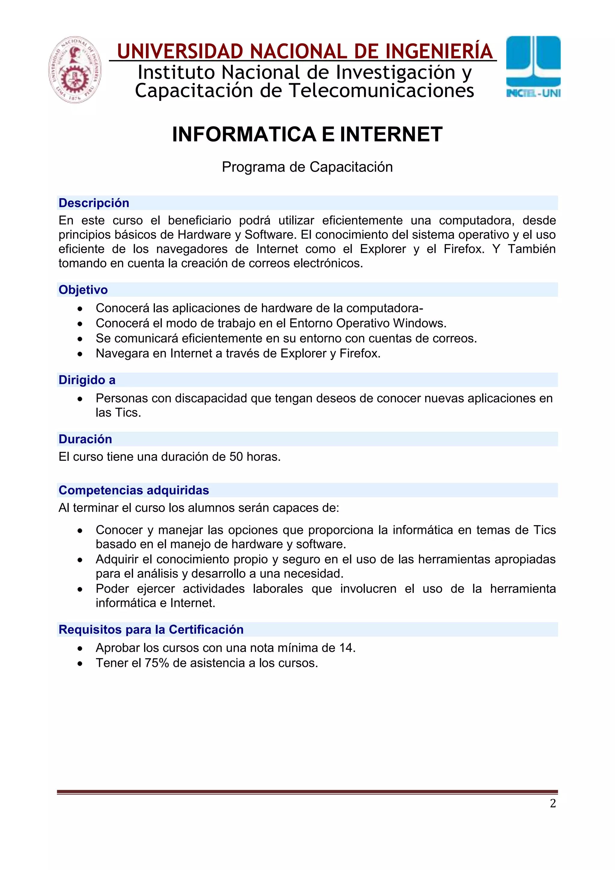 Este documento describe un curso de capacitación en informática e internet ofrecido por la Universidad Nacional de Ingeniería. El curso enseña conceptos básicos de hardware y software, el sistema operativo Windows, y el uso de navegadores e internet. El curso dura 50 horas y está dirigido a personas con discapacidad. Los estudiantes aprenderán a usar una computadora y herramientas de internet de manera eficiente.