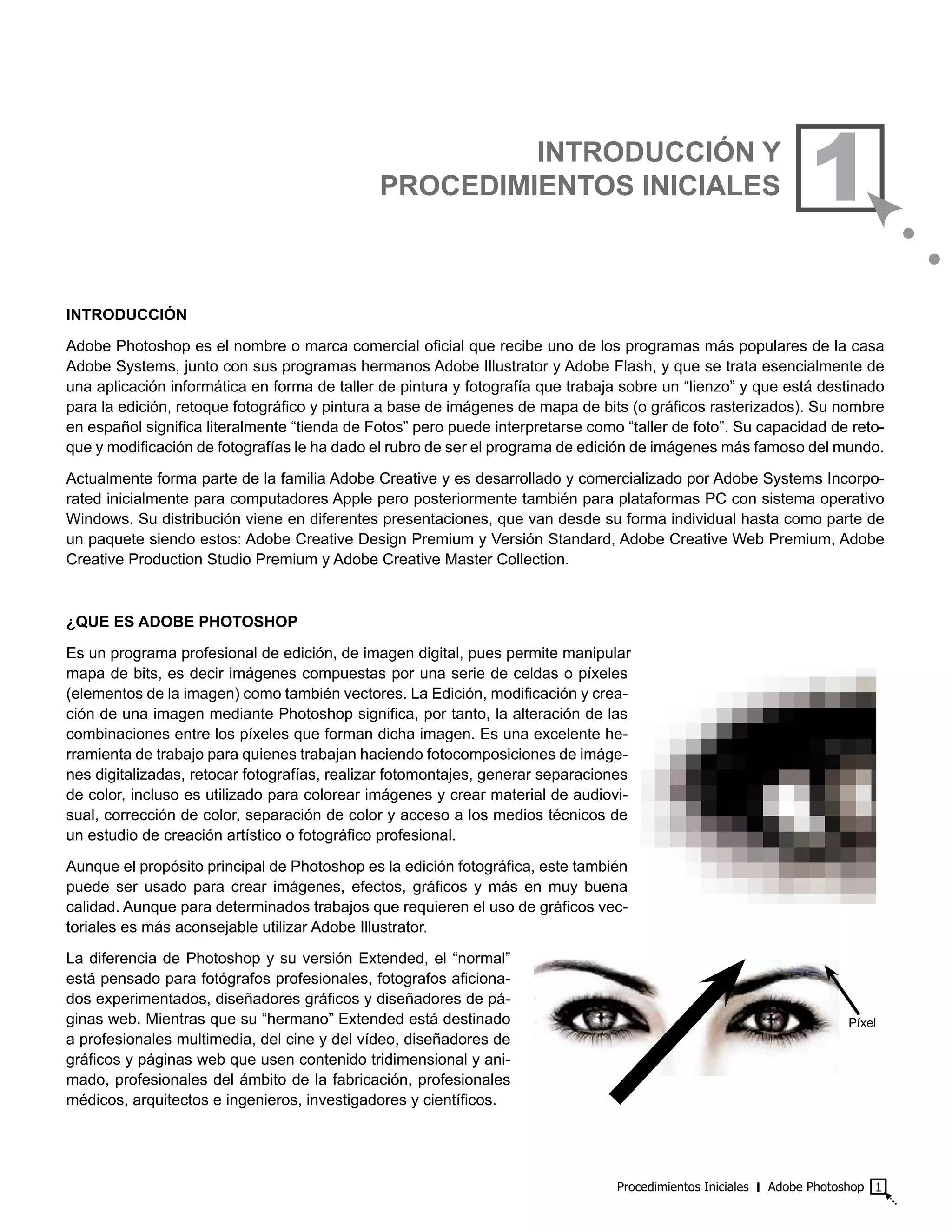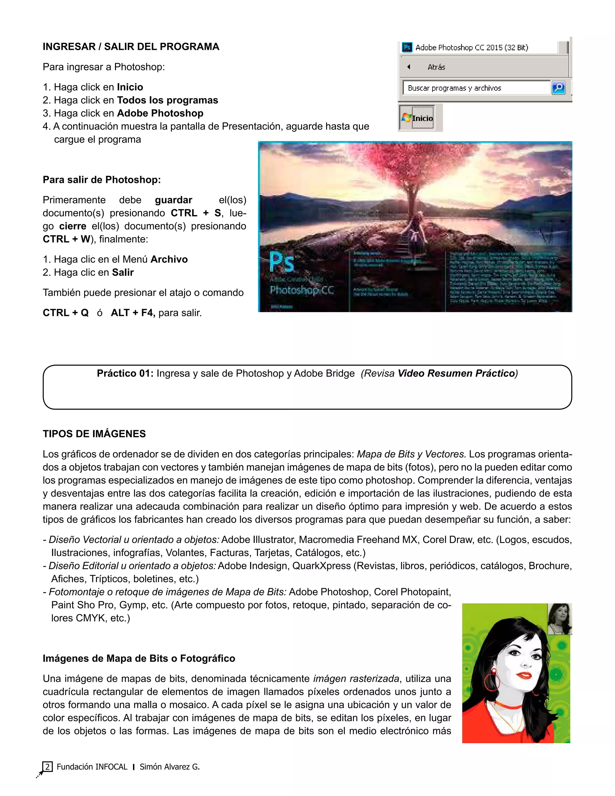 Adobe Photoshop es un programa de edición de imágenes digitales que permite manipular y modificar mapas de bits (imágenes compuestas por píxeles) y vectores. El documento explica los procedimientos iniciales para ingresar y salir del programa, los tipos de imágenes que puede editar (mapas de bits y vectores), e introduce la interfaz del usuario con sus menús, barras, paneles y herramientas.