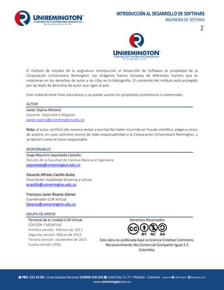 Este documento presenta una introducción al programa de ingeniería de sistemas de la Universidad Remington. Explica el contexto histórico del surgimiento de la ingeniería de sistemas y su importancia. También define el rol del ingeniero de sistemas en Colombia y describe los factores diferenciales del programa de ingeniería de sistemas de la Universidad Remington, incluyendo su misión, valores, justificación, plan de estudios y componentes de formación.