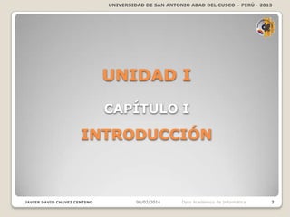 Este documento presenta una introducción a la informática. Explica que la informática estudia el tratamiento automático de la información mediante computadoras. Describe los componentes clave de un sistema informático incluyendo hardware, software, personal informático y firmware. También explica conceptos como datos, información, programas y cómo las computadoras representan y procesan la información utilizando el sistema binario de ceros y unos.