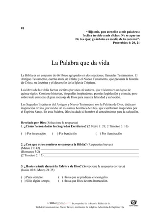 El documento resume las principales características y enseñanzas de la Biblia. Explica que la Biblia fue escrita por 40 autores divinamente inspirados durante 15 siglos y contiene el mensaje de Dios para la salvación humana. Además, destaca que la Biblia tiene poder para transformar vidas, contiene anticipaciones científicas y debe ser estudiada y obedecida para lograr un crecimiento espiritual y participar de la naturaleza divina.