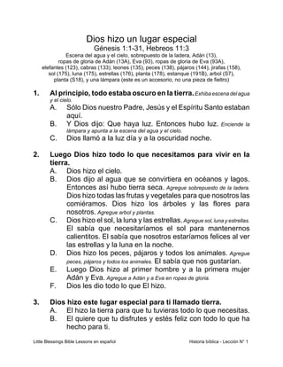 La lección 1 de Little Blessings Bible Lessons en español se enfoca en cómo Dios creó un lugar especial llamado la Tierra. La lección incluye historias, manualidades y canciones que enseñan que Dios creó el cielo, la tierra, plantas, animales, el sol, la luna y las estrellas para que los niños disfruten y tengan todo lo que necesitan. La lección concluye que Dios hizo este lugar especial llamado Tierra para que los niños tengan todo lo que necesitan y se diviertan con lo que Él ha