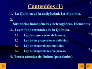 Este documento presenta las leyes fundamentales de la química, incluyendo la ley de conservación de la masa, las leyes de proporciones definidas y múltiples, la hipótesis de Avogadro y la teoría atómica de Dalton. También explica conceptos como masas atómicas y moleculares, mol, composición centesimal, fórmulas empíricas y moleculares.