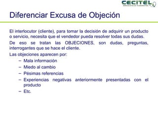 Este documento describe diferentes técnicas para manejar objeciones de clientes durante el proceso de ventas. Explica la diferencia entre excusas y objeciones, y que detrás de una excusa a menudo se esconde la verdadera objeción. Luego detalla técnicas como la refutación directa, la técnica "sí pero...", hacer preguntas, la paráfrasis y la técnica del "boomerang" o cambio positivo.