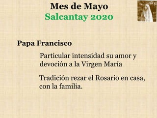 El documento habla sobre el mensaje de la Virgen de Fátima y la importancia de rezar el Rosario. En particular, destaca que la Virgen se apareció a tres niños en Fátima en mayo de 1917 y les pidió que rezaran el Rosario y ofrecieran sacrificios por los pecadores. También menciona que el Papa Juan Pablo II creía que sobrevivió a un atentado en 1981 gracias a la intercesión de la Virgen de Fátima.