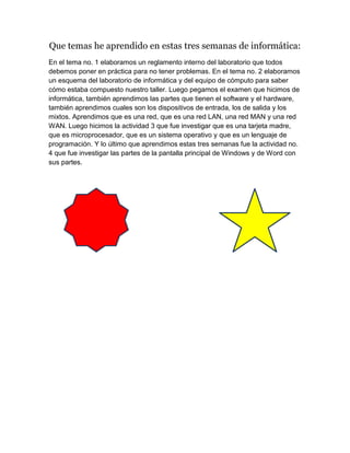 El estudiante aprendió varios temas clave de informática en tres semanas, incluyendo elaborar un reglamento para el laboratorio, esquematizar el equipo de cómputo, identificar dispositivos de entrada, salida y mixtos, comprender redes LAN, MAN y WAN, e investigar componentes como tarjeta madre, microprocesador, sistema operativo y lenguaje de programación, así como las partes de las interfaces de Windows y Word.