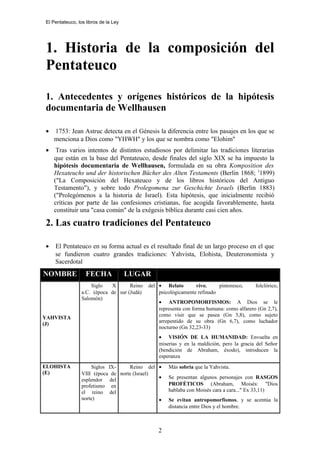 Este documento resume el contenido y composición del Pentateuco (los primeros cinco libros de la Biblia) según la hipótesis documentaria. Explica que el Pentateuco está compuesto por cuatro tradiciones principales - Yahvista, Elohista, Deuteronomista y Sacerdotal - que fueron fusionadas en un proceso largo. Brevemente describe cada tradición y su fecha y lugar de origen según esta teoría. También resume la estructura y contenido de los libros individuales que componen el Pentateuco, como Génes