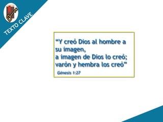 El documento resume la creación del hombre a imagen de Dios, la caída en el pecado que destruyó esa imagen, y el plan de Dios a través de Jesucristo para restaurar la imagen divina en la humanidad mediante la santificación del Espíritu Santo. La iglesia tiene un papel en colaborar con Cristo para llevar a las personas a una restauración física, mental y espiritual de la imagen de Dios en ellos.