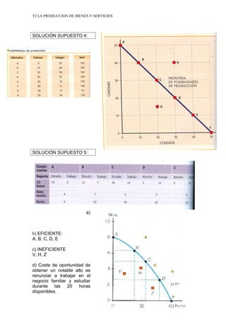 Este documento presenta dos supuestos sobre la frontera de posibilidades de producción. El primer supuesto describe un país que produce cañones o colegios con todos sus factores de producción. Se pide representar la frontera de posibilidades, calcular el coste de oportunidad de construir 20 colegios y explicar el significado de los puntos G y H. El segundo supuesto trata sobre una estudiante que reparte su tiempo entre estudiar y trabajar. Se pide representar su frontera de posibilidades personal, identificar los puntos eficientes, señalar un punto ineficiente