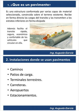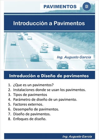 Este documento presenta una introducción a los pavimentos. Explica que los pavimentos son estructuras conformadas por capas de materiales que reciben las cargas del tránsito y las transmiten a los estratos inferiores. Se usan en caminos, patios de carga, terminales terrestres, carreteras, aeropuertos y estacionamientos. Explica los tipos de pavimentos como flexibles, rígidos y articulados, y los parámetros de diseño como espesores, materiales y condiciones externas como clima y tráfico