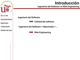 Este documento presenta una introducción a las metodologías para el desarrollo de sistemas web, describiendo varias metodologías como WSDM, SOHDM, RNA, HFPM, OOHDM, UWE, W2000, UWA y NDT. Explica que estas metodologías se han enfocado principalmente en las etapas de diseño e implementación, mientras que el tratamiento de requisitos ha recibido menos atención. El documento luego describe los enfoques de cada metodología para la ingeniería de requisitos.