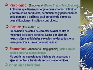 Este documento describe la violencia intrafamiliar en Chile. Define la violencia intrafamiliar como el abuso de poder entre miembros de una familia, que puede ser físico, psicológico, sexual o económico. Presenta cifras sobre la prevalencia de la violencia conyugal y el maltrato infantil en Chile, así como los efectos de la violencia intrafamiliar en la salud física y mental de las víctimas. Finalmente, discute la importancia de prevenir y abordar este problema social.