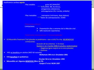 Este documento presenta el caso de un paciente de 23 años que consulta por tos seca y rinitis. Luego comienza a presentar episodios de dolor epigástrico y arritmias. Los exámenes revelan hipotiroidismo, disfunción ventricular izquierda y derrame pericárdico. El diagnóstico presuntivo es miocarditis, el cual es confirmado mediante resonancia magnética cardiaca. El paciente es internado para tratamiento de la miocarditis.