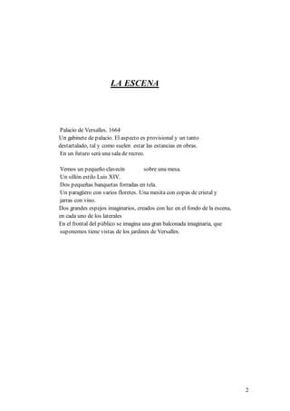 El resumen presenta una escena en Versalles en 1664 donde Molière y Lully se encuentran. Molière se burla del hecho de que Lully está muriendo de gangrena causada por golpearse el dedo del pie con un bastón durante una composición musical. También discuten sobre el rey, la reina y la amante del rey Louise la Vallière. Molière lee una carta antigua que inició su relación con Lully.