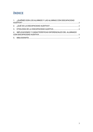 Este documento describe la discapacidad auditiva y sus implicaciones en los alumnos. Explica que la discapacidad auditiva se define como la pérdida o anormalidad de la función auditiva, lo que causa dificultades para oír y acceder al lenguaje oral. Detalla las diferentes clasificaciones de la pérdida auditiva y sus causas, e identifica las consecuencias cognitivas, de desarrollo sensorial, motor y socioafectivo que puede tener una sordera profunda en los alumnos. Finalmente, proporciona una bibliografía sobre
