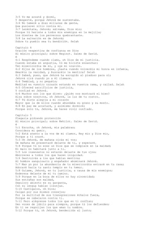 Este documento contiene los primeros 10 capítulos del libro de los Salmos de la Biblia. Los salmos describen la alabanza a Dios, oraciones de confianza, peticiones de protección y justicia, y lamentaciones. Los salmos expresan temas como la bendición de los justos, el reino de Dios, la salvación divina, y la destrucción final de los malvados.