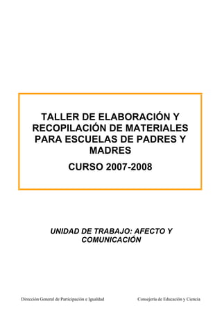 Este documento presenta un taller sobre comunicación y afecto en las familias. Contiene cuatro secciones principales: 1) una introducción sobre la importancia del afecto y la comunicación entre padres e hijos a medida que estos crecen, 2) los objetivos del taller, 3) los contenidos a cubrir, y 4) una secuencia detallada de actividades que incluyen discusiones y ejercicios prácticos para mejorar la comunicación familiar.