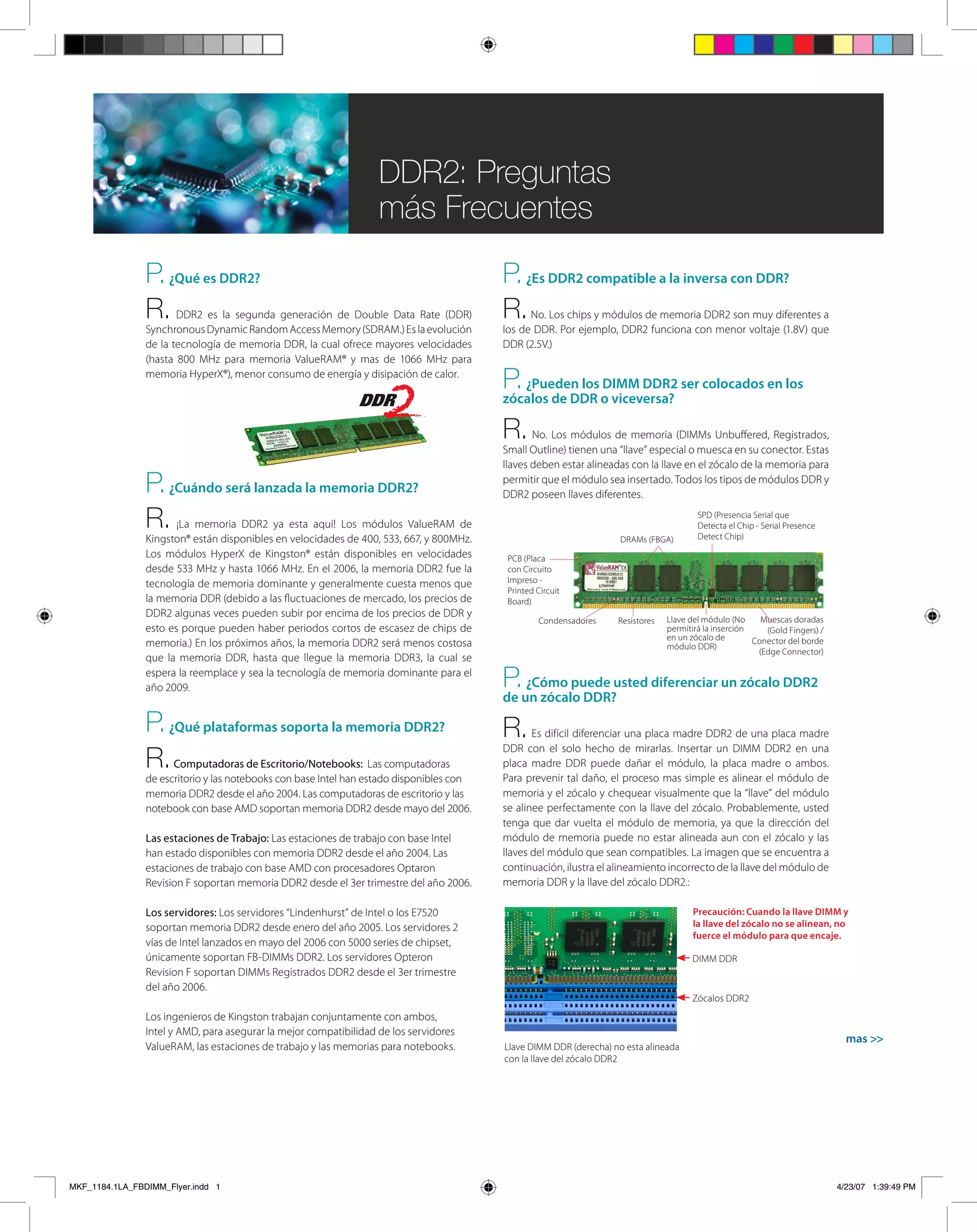 DDR2 es la segunda generación de memoria SDRAM que ofrece mayores velocidades y menor consumo de energía que DDR. Los módulos DDR2 no son compatibles con zócalos DDR debido a diferencias en el diseño de los chips y conectores. DDR2 está disponible en una variedad de velocidades y formatos para computadoras de escritorio, notebooks y servidores.