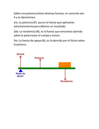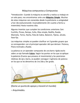 Este documento describe las máquinas simples y compuestas. Introduce las máquinas simples como aquellas que realizan su trabajo en un solo paso, como cuchillos, ruedas y palancas. Luego explica que las máquinas simples se pueden clasificar en tres grupos principales: palancas, planos inclinados y ruedas. Finalmente, detalla las tres fuerzas que actúan sobre una palanca: la potencia, la resistencia y la fuerza de apoyo.