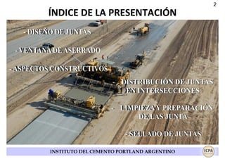 Este documento presenta información sobre el diseño y construcción de juntas en pavimentos de hormigón. Explica que las juntas permiten controlar la fisuración mediante su adecuado diseño y ejecución. Describe los tipos de juntas transversales y longitudinales, y los factores que influyen en su disposición, como la resistencia del hormigón y las condiciones ambientales. También cubre temas como la transferencia de carga, el aserrado de juntas y la colocación de pasadores. El objetivo es proveer una gu