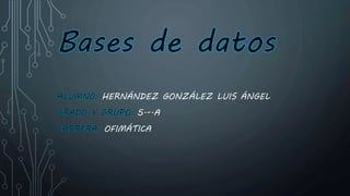 Este documento trata sobre bases de datos. Explica que una base de datos es una colección de datos organizada de forma que se puedan seleccionar rápidamente los fragmentos necesarios. Luego describe algunos sistemas de gestión de bases de datos como SQL y NoSQL, resaltando sus características principales como la escalabilidad. Por último, menciona algunas bases de datos específicas como MongoDB, SQL Server y Cassandra.