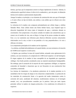 Este documento habla sobre las estructuras de madera. Brevemente describe que la madera es un material noble que se ha utilizado ampliamente en la construcción y la industria. Explica que la madera está compuesta principalmente de celulosa y lignina. También cubre las propiedades físicas de la madera como la humedad, densidad y peso específico. Finalmente, menciona las principales familias maderables como las coníferas y latifoliadas.