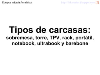 El documento describe los diferentes tipos de carcasas para equipos informáticos, incluyendo sobremesa, torre, portátil, rack, TPV, barebone y ultrabook. Explica los elementos externos comunes de una carcasa como LEDs, ranuras para unidades, puertos USB, jacks y botones de encendido y reinicio.