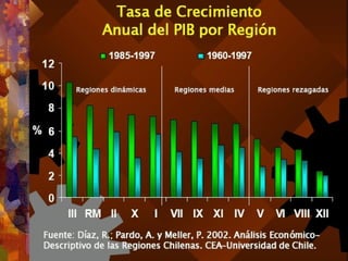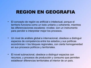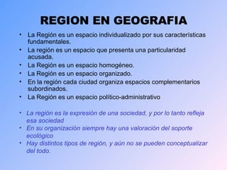 El documento trata sobre el concepto de región en geografía. Define la región como un espacio homogéneo y organizado que presenta características fundamentales propias. También discute diferentes tipos de regiones según su escala de análisis, como regiones naturales, funcionales, político-administrativas y económicas. Finalmente, analiza la situación de las regiones de Chile y los desafíos de descentralización.