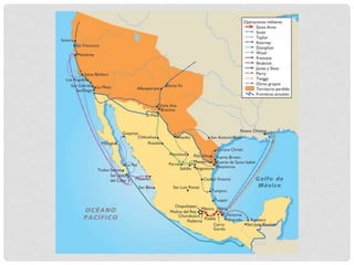 El documento resume varios conflictos y cambios políticos en México durante el siglo XIX, incluyendo la independencia de Texas debido al descuido colonial, la separación cultural y la política expansionista de EE.UU.; la guerra de los pasteles entre México y EE.UU. sobre reclamaciones de daños que terminó con la ocupación estadounidense de Veracruz; y la guerra entre México y EE.UU. que resultó en la pérdida de territorio mexicano con el tratado de Guadalupe-Hidalgo.