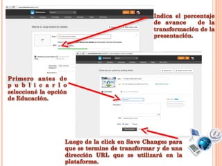 El documento explica los pasos para compartir una presentación de PowerPoint en SlideShare. Estos incluyen dar click en "Share" para copiar el código embed, pegar el código en la plataforma Icon 2.0 e ir al final para guardar la presentación compartida.