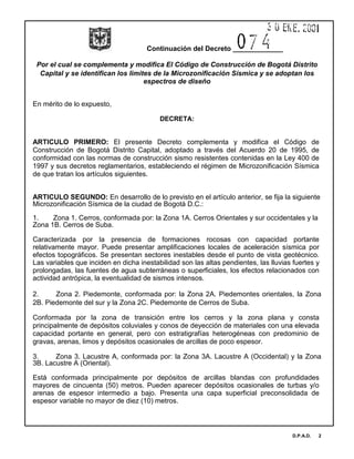 Este decreto modifica el Código de Construcción de Bogotá para establecer un régimen de Microzonificación Sísmica. Define 5 zonas sísmicas en la ciudad con diferentes características geológicas y riesgo sísmico. Adopta el Mapa de Microzonificación Sísmica de Bogotá y los espectros de diseño contenidos en el estudio de Microzonificación Sísmica de la ciudad.