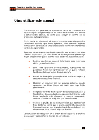 Este documento presenta un manual de formación en derecho penal para el personal de seguridad privada. Explica cómo utilizar el manual de forma efectiva, incluyendo realizar lecturas, subrayar ideas clave, elaborar esquemas y resúmenes. Además, describe los iconos que se utilizan a lo largo del manual para facilitar la comprensión de los contenidos.