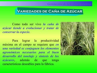 El documento describe la genotecnia de la caña de azúcar, incluyendo el proceso de mejoramiento genético para obtener nuevas variedades, las causas del deterioro de las variedades existentes, y los métodos para conservar los recursos fitogenéticos de la caña de azúcar, como la conservación in situ en jardines de germoplasma y la crioconservación.