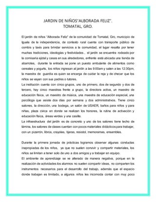 Este documento presenta un diagnóstico del Jardín de Niños "Alborada Feliz" en Tomatal, Gro, México. Se identifica la falta de convivencia entre los estudiantes como un problema, ya que no comparten materiales ni trabajan en equipo. El proyecto busca mejorar la convivencia aplicando estrategias didácticas como juegos y actividades que promuevan el respeto, la tolerancia y la inclusión entre los estudiantes.