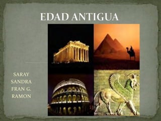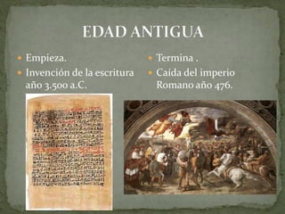 El documento abarca la invención de la escritura alrededor del 3.500 a.C. y la caída del Imperio Romano en el 476 d.C., además de mencionar el desarrollo de las primeras ciudades y la influencia de culturas antiguas como la romana, griega y egipcia. Destaca la importancia de estas civilizaciones, que construyeron monumentos y dejaron un legado cultural, incluyendo el alfabeto latino y jeroglíficos. También se menciona el descubrimiento de América en 1492 y la Revolución Francesa en 1789.