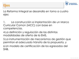 La Reforma Integral de la Educación Media Superior en México se basa en cuatro ejes: 1) la construcción de un Marco Curricular Común con competencias, 2) la definición de modalidades de oferta como escolarizada, no escolarizada y mixta, 3) la implementación de mecanismos de gestión como formación docente y evaluación, y 4) un modelo de certificación nacional de egresados.