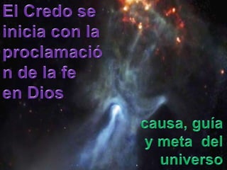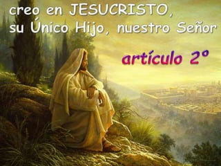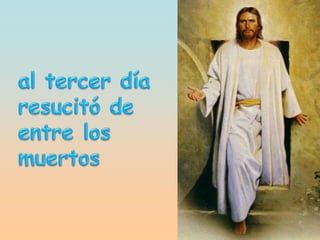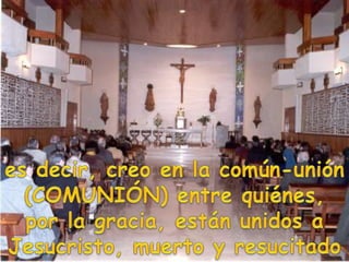 Este documento resume los principales puntos de fe contenidos en el Credo de los Apóstoles, incluyendo la creencia en Jesucristo como Hijo de Dios, su pasión, muerte y resurrección, la vida después de la muerte y el juicio final. Explica brevemente algunos de los símbolos asociados con la pasión de Cristo como INRI y su descenso a los infiernos antes de la resurrección de los muertos.