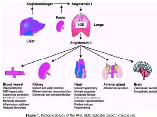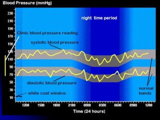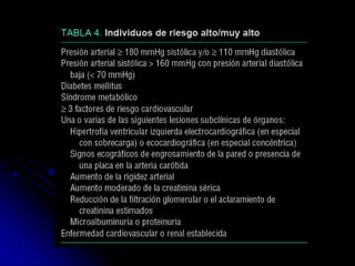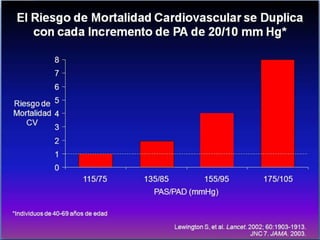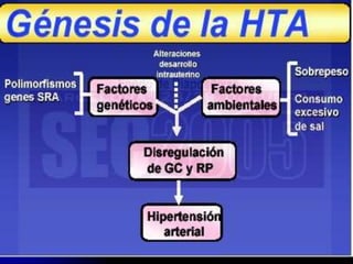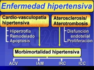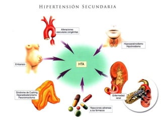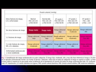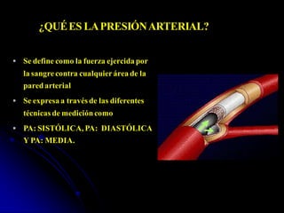 El documento define la presión arterial y explica que es la fuerza ejercida por la sangre contra las paredes arteriales. Explica que la hipertensión arterial se define como una presión arterial sistólica mayor a 140 mmHg o una presión arterial diastólica mayor a 90 mmHg. Finalmente, presenta estadísticas sobre la prevalencia de hipertensión a nivel mundial, Latinoamérica y Perú.